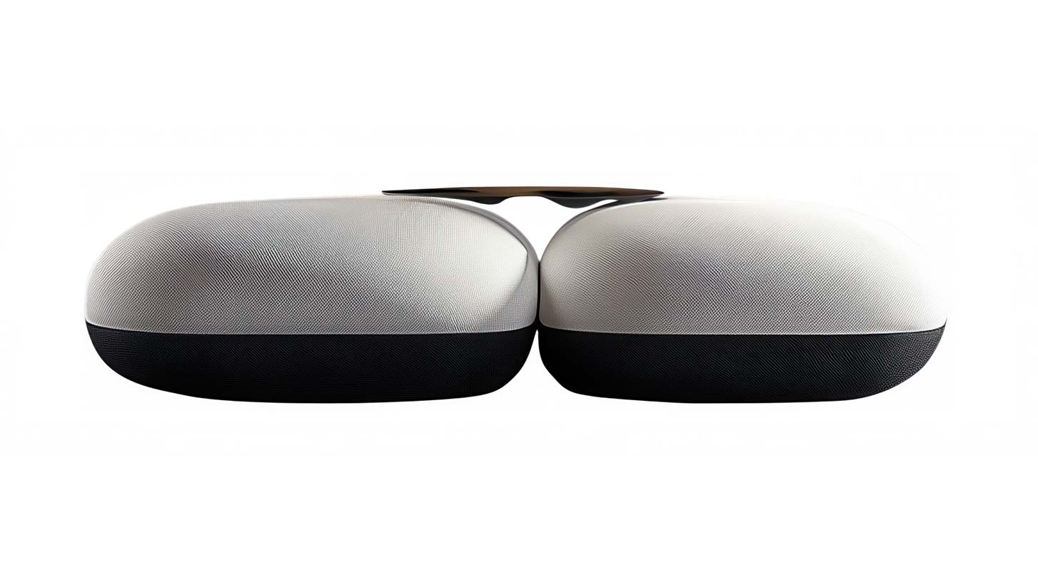 Basic Bubble Sofas collection includes two modular pieces, each with an oval shape and rounded edges, creating a puffy and inflated appearance. These pieces resemble large bubbles, giving them a unique and playful look. The upholstery features a distinctive color scheme, with two-thirds of the upper part covered in white fabric, and the lower one-third extending to the floor in black fabric. This combination creates a striking contrast and a contemporary aesthetic. The modular pieces can be used individually or placed next to each other, offering versatility in arrangement and allowing for creative configurations to suit various spaces.