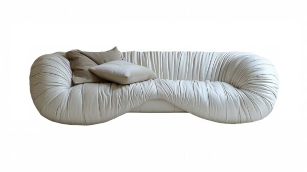 Harper W Pearl sofa is crafted entirely from high-quality white leather, giving it a sleek and elegant appearance. The design features an organic, amorphous form that seamlessly blends the backrest, armrests, and front part of the seat. The leather on the backrest, armrests, and front of the seat is finely wrinkled, adding texture and an element of casual luxury. The front part of the seat resembles a large wave, which descends over the recessed part of the seat, creating an extraordinary visual effect. This high-quality white leather sofa combines elegance with modern design elements, featuring a unique wave-like fold on the front of the seat. It is a perfect blend of style and comfort, making it a standout piece in any interior setting.