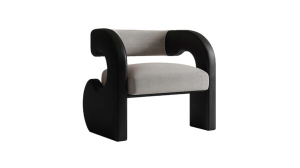 Isara Stellar lounge armchair exudes modern elegance with its sleek design. Crafted from solid black matte wood, it boasts a sophisticated look. The seat and part of the backrest are upholstered in a light gray fabric, providing a striking contrast against the dark wood. The armrests are uniquely designed with an angular curve; on one side, the armrest descends straight, while on the other, it has a straight descent with a semicircular extension, adding a touch of artistic flair.